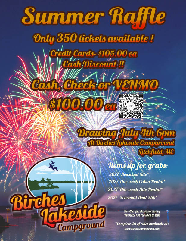 - Drawing will be at 6 pm on the July 4th , 2026 at Sunset Point Birches Lakeside Campground 201 Norris Point Rd. Litchfield Maine.